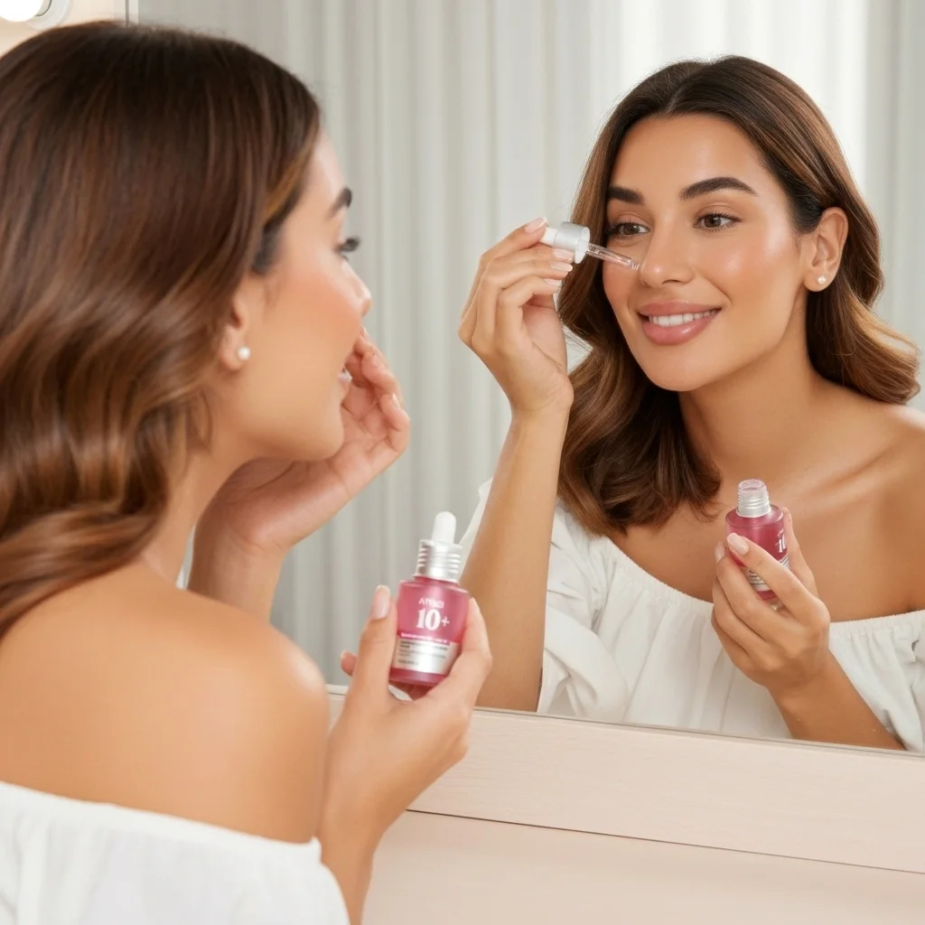 ضعي 3 إلى 5 قطرات من السيروم على الوجه والرقبة.
