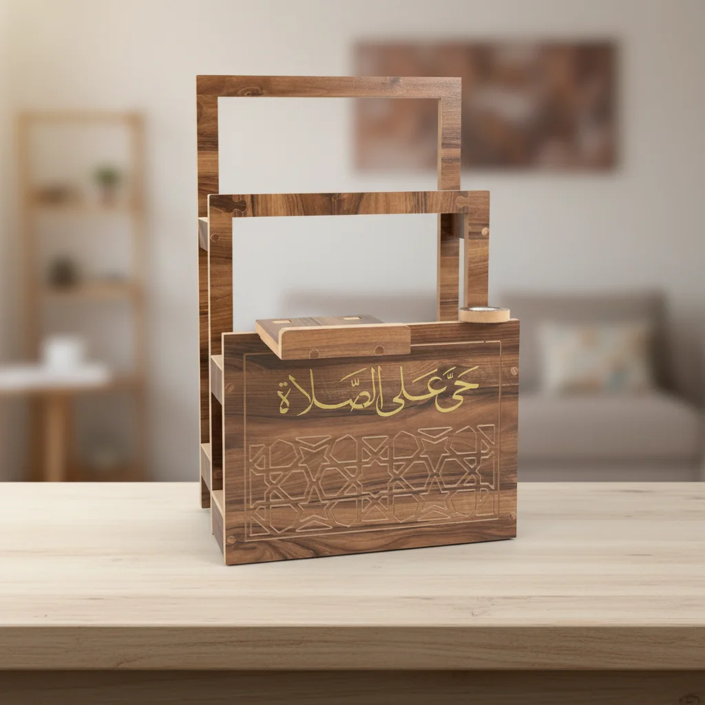 بالإضافة إلى المبخرة لتستمتع برائحة عطرة وتحافظ على أجواء الروحانية والسكينة أثناء الصلاة. أما بالنسبة لشكل الستاند فهو مميز جدًا ومتين ومزخرف بشكل فسيفسائي يحمل الطابع الديني مع جملة “حي على الصلاة” في أعلاه.